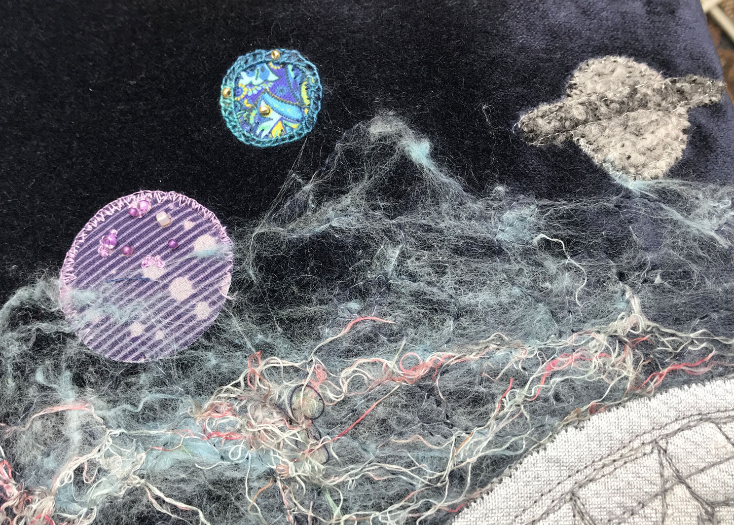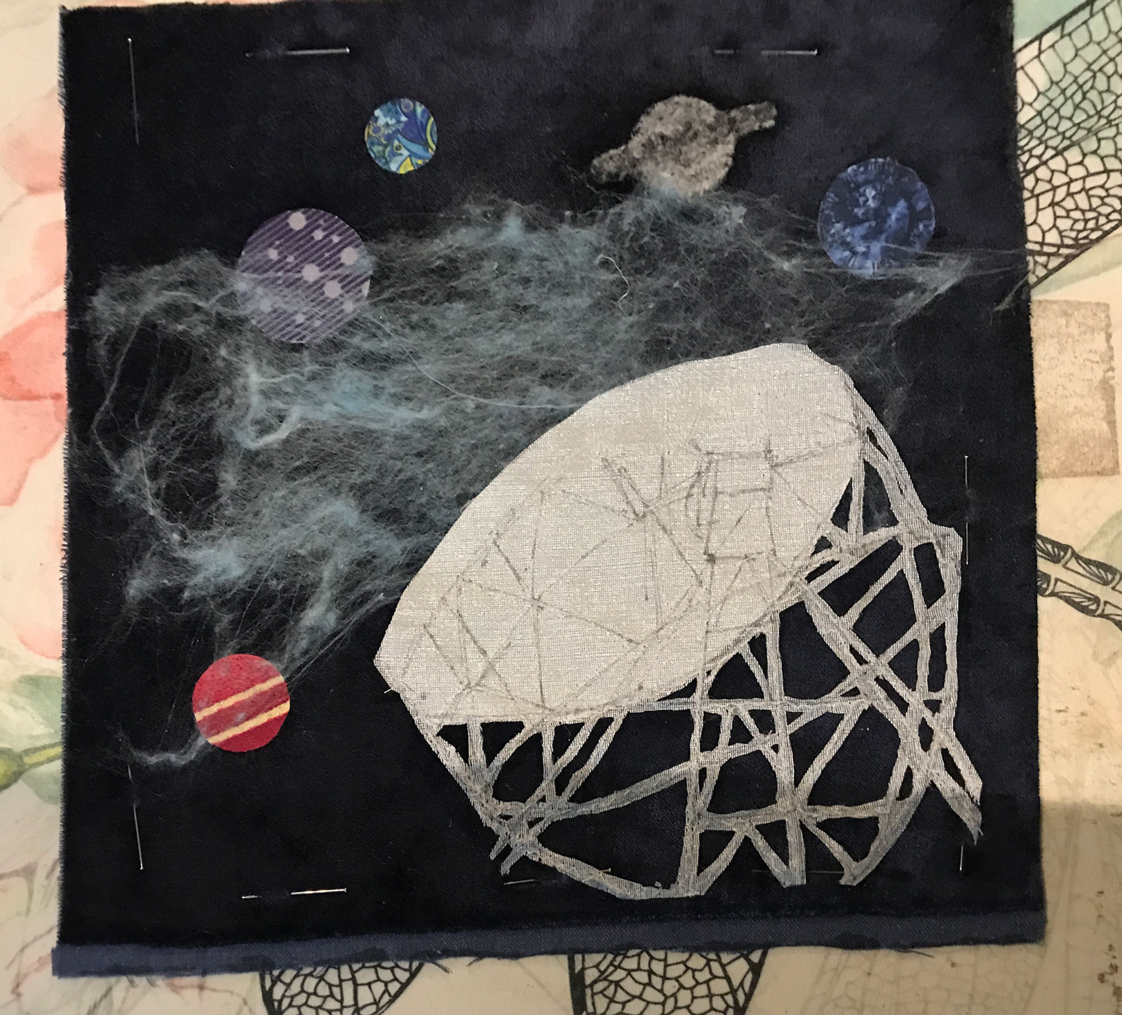 The square, which was to be 23 x 23 cm, became quite complicated, but the more I did the more I enjoyed it. The planets got beads and the galaxy effect was created with silks.